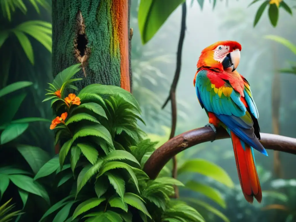 Una escena mágica en la jungla con una persona y su mascota exótica, un guacamayo arcoíris